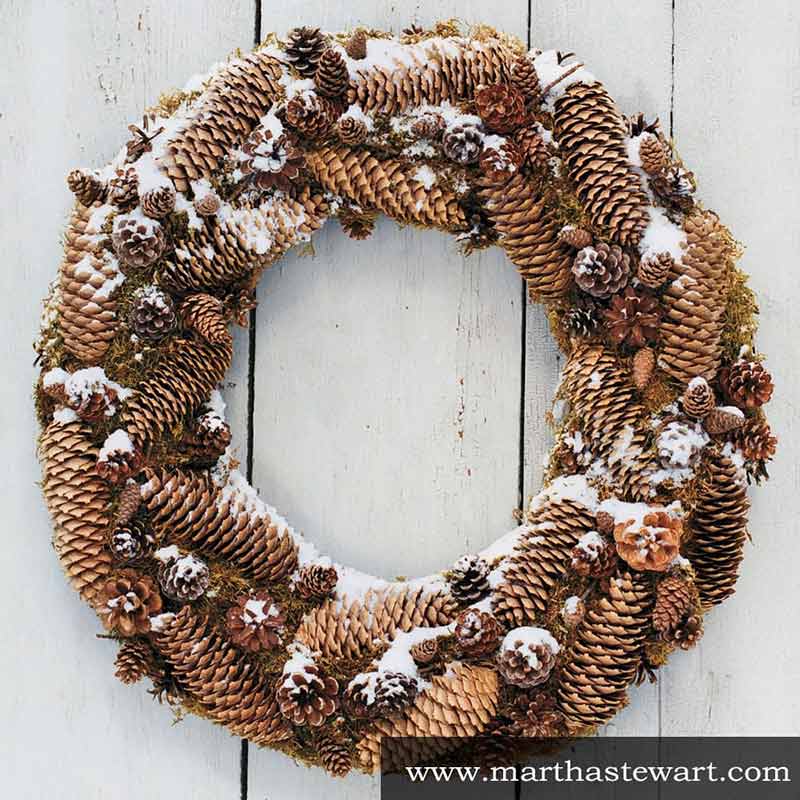 - Венок. Соедините шишки проволокой, формируя круг. Добавьте веточки хвои, орехи или ягоды для объёма. По желанию окрасьте в золотой или серебряный цвет.
