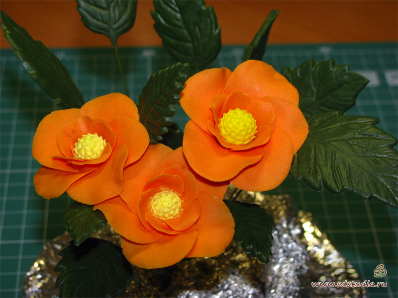 Желтые серединки - смесь Модены и желтого пластика Hearty 1:1, оранжевые лепестки - смесь Модены и оранжевого Hearty 1:6. Сохнет полученная смесь так же быстро, как и чистая Modena Clay, так что через пару-тройку часов цветы уж можно безбоязненно трогать, а через 5-6 часов собирать в композицию.