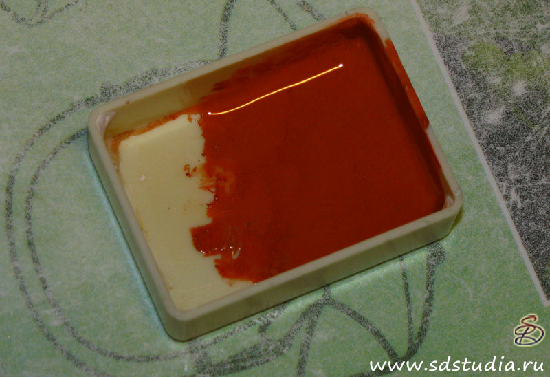 Вместо разведенных в воде пигментов можно использовать подкрашенную краской воду. В этом случае надо брать краску, которая растворяется в воде без остатка, например - акварель. Подкрашенную краской воду добавляем в пластик и тщательно его "месим", добиваясь полного окрашивания всего куска. Если не получится равномерно все перемешать, можно получить в итоге "мраморный" прокрас пластика из-за неравномерного распределения цвета.