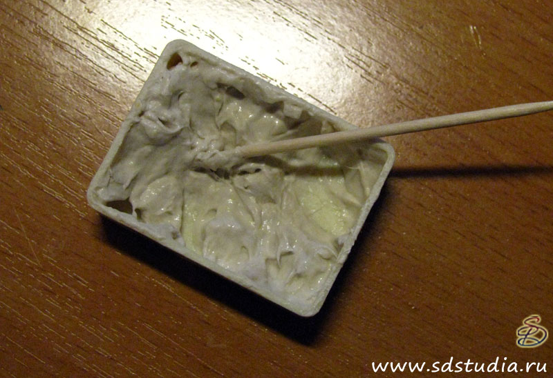 Для мелкой детальной доработки изделия (например, кукольного лица, кукольных ручек, мелких деталей любых изделий кукольной миниатюры) можно сделать из этого пластика шликер, и пользоваться уже им. Что такое шликер? Это разведенный до состояния густой сметаны пластик. Разводить можно просто водой, но я чаще использую смесь из воды и клея ПВА 1 : 1. Это придает поверхности после высыхания дополнительную твердость.