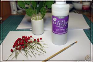 Масло на пластике сохнет довольно долго, его лучше просушивать в течение суток. А вот акриловые краски сохнут очень быстро, через полчаса можно продолжать работу. Теперь окрашенные ягодки можно залакировать. Для лакировки использую лак глянцевый водостойкий акриловый фирмы Padico. Можно использовать любой аналог. Брать глянцевый или матовый лак - так же зависио от вашей идеи. Если вам не требуется блеск на ягодках, можете покрыть их матовым лаком. Мне был необходим блеск, поэтому я взяла глянцевый лак.
