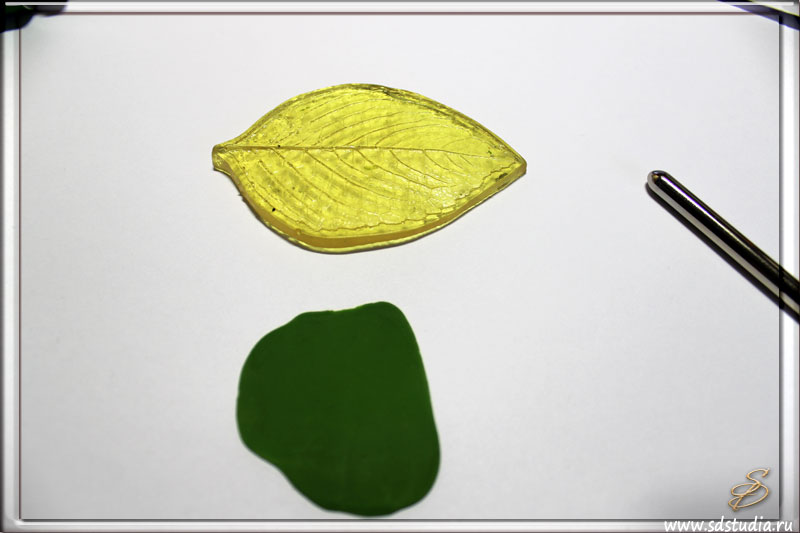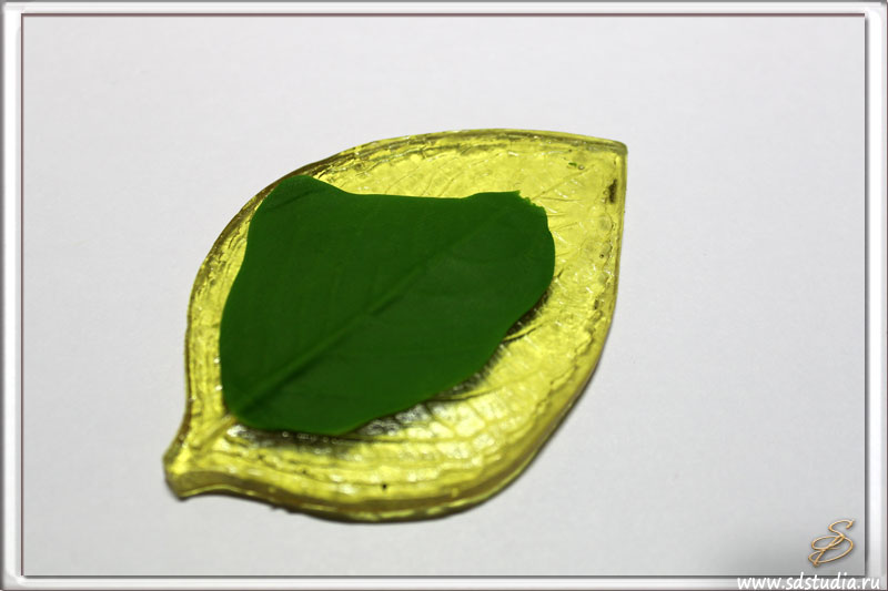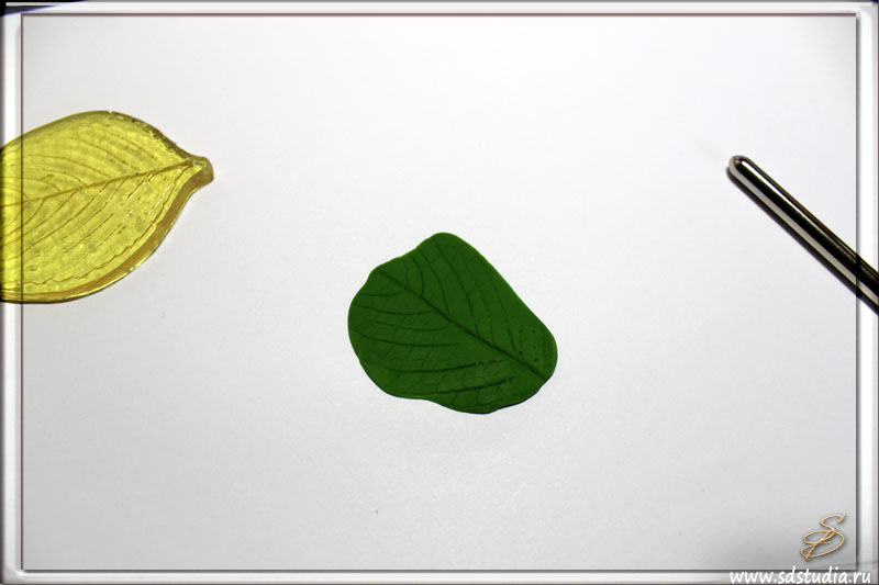 Раскатанный пластик накладываю на молд и приминаю пальцами, чтобы получить четкий отпечаток фактуры листа.