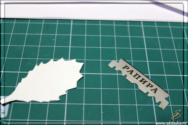 Теперь беру заранее подготовленную форму листа из плотной бумаги и половинку бритвенного лезвия. Вместо лезвия можно использовать макетный нож, но тут будут свои особенности.