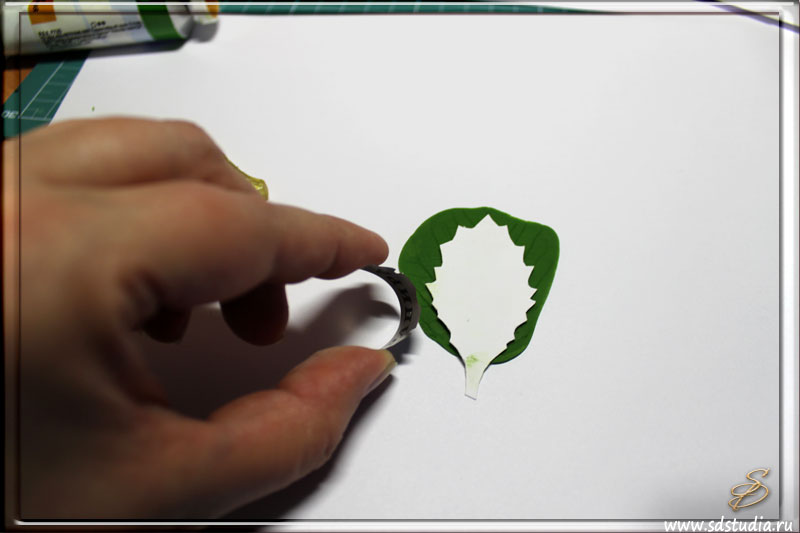 Накладываю форму на раскатанный пластик, стараясь сделать так, чтобы центральный желобок оттиска листа шел четко от верхушки листа до ножки. Половинку лезвия сгибаю полукругом, и приступаю к вырезанию листа. Если вы решили использовать макетный нож, то просто ведете самым кончиком ножа по пластику вдоль бумажной кромки, вырезая необходимую форму.