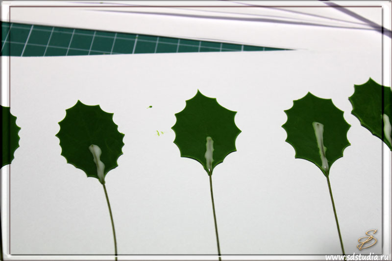 Все листочки раскладываю на чистом листе бумаги и оставляю сохнуть. Для полного высыхания пластика и клея достаточно 5-6 часов.