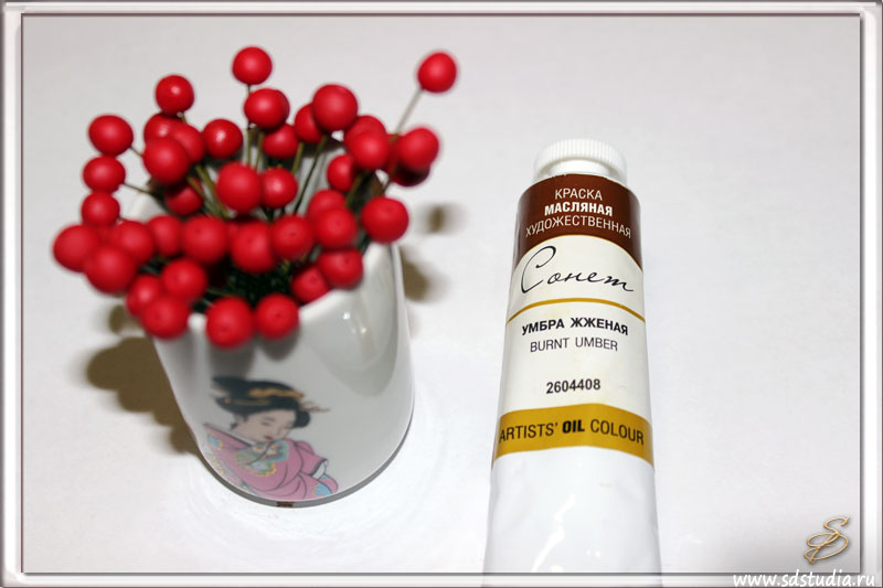 После того как ягодки подсохли (на это требуется 2-4 часа) можно подкрасить коричневой краской впадинки. Для этого я беру краску масляную оттенка "Умбра жженая". Если нет масла, то можно использовать и акрил. Для внешней покраски это не имеет значения.