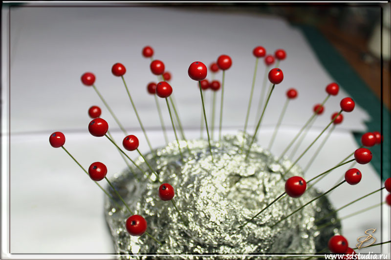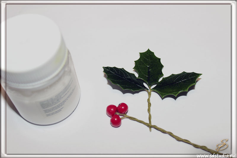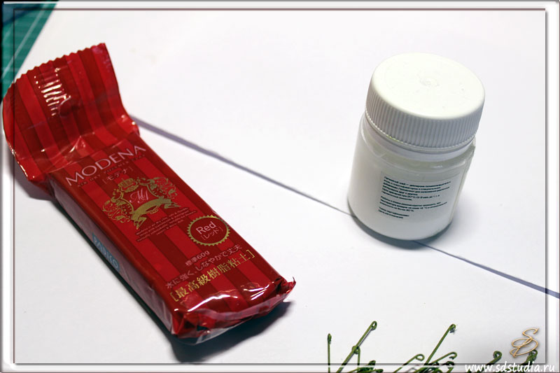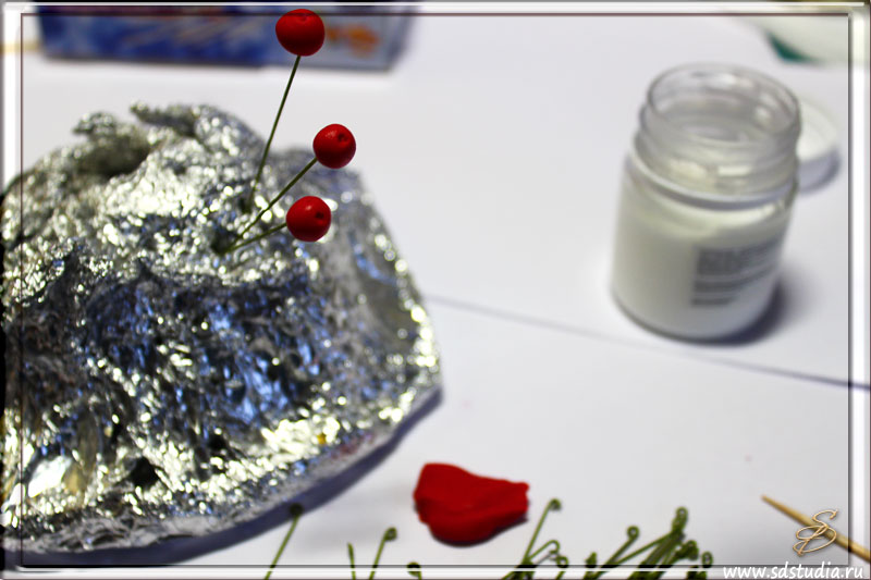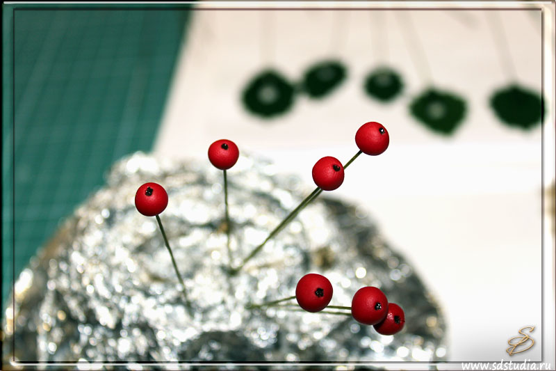 Теперь беру пластик Modena красный и клей (латексный или ПВА). Из пластика делаю маленькие шарики-ягодки, петельку на проволочке-ножке смазываю клеем и втыкаю в ягодку.