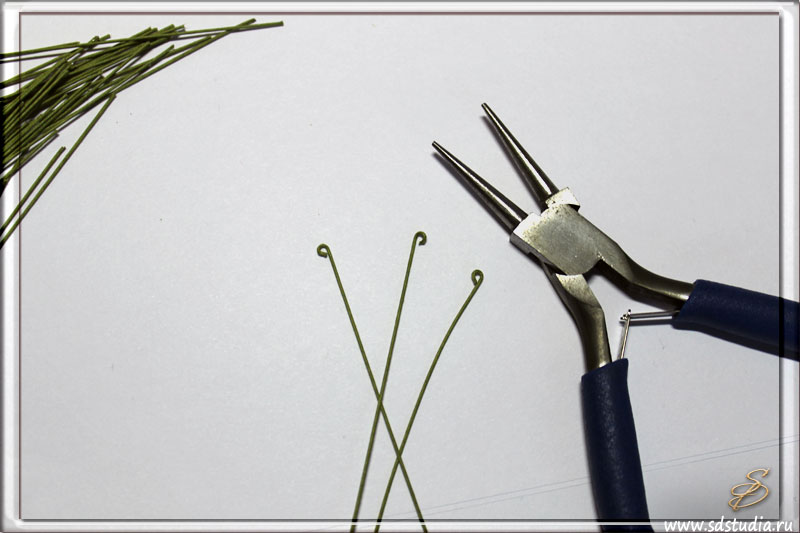 Для ножек под ягодки круглогубцами делаю петельки на всех проволочках. Это делается для того, чтобы засохшие ягоды не "соскакивали" с черенков.