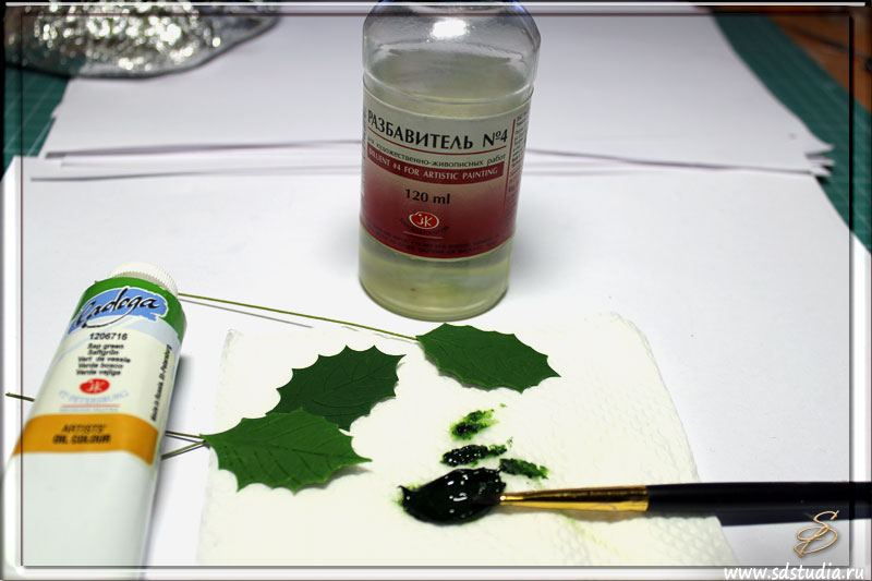 После того как листочки полностью высохли, ножки приклеились намертво. Теперь надо их оживить. Ведь в природе не бывает совершенно однотонных листьев. Поэтому я опять беру масляную краску "Травяной зеленый", слегка разбавляю ее растворителем Пиненом и начинаю тонировать листочки. Тонирую от центра к краям, очень тонким, "прозрачным" слоем. Мне не нужна плотная покраска, мне нужны переходы и оттенки. По краям тонировку можно растирать бумажной салфеткой, чтобы не было четких границ.