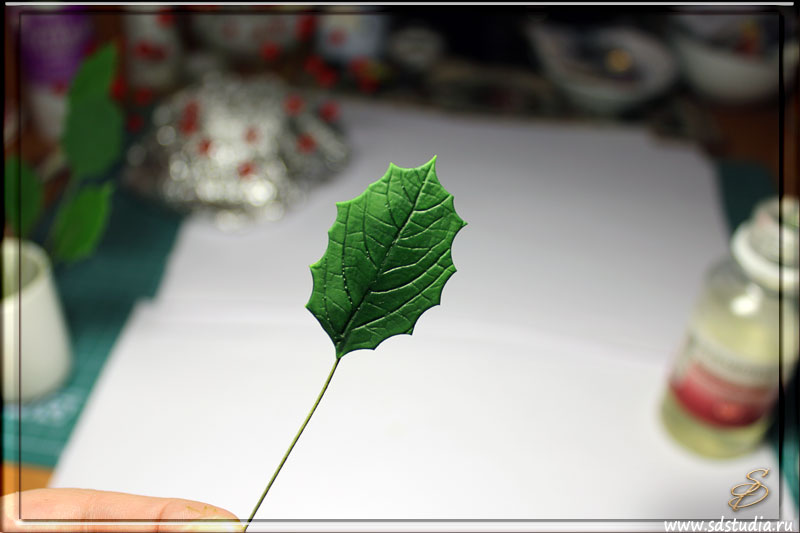 Обматывая ножки тейп-лентой периодически промазываю под ней клеем. Так сборка веточки будет крепче, меньше шансов ее повредить. Она не развалится, листик или ягодка не выпадет. К макушке через равные промежутки прикручиваю листики с ягодками. На один листочек - две ягодки. Ягодки крепятся в пазухах листочков.