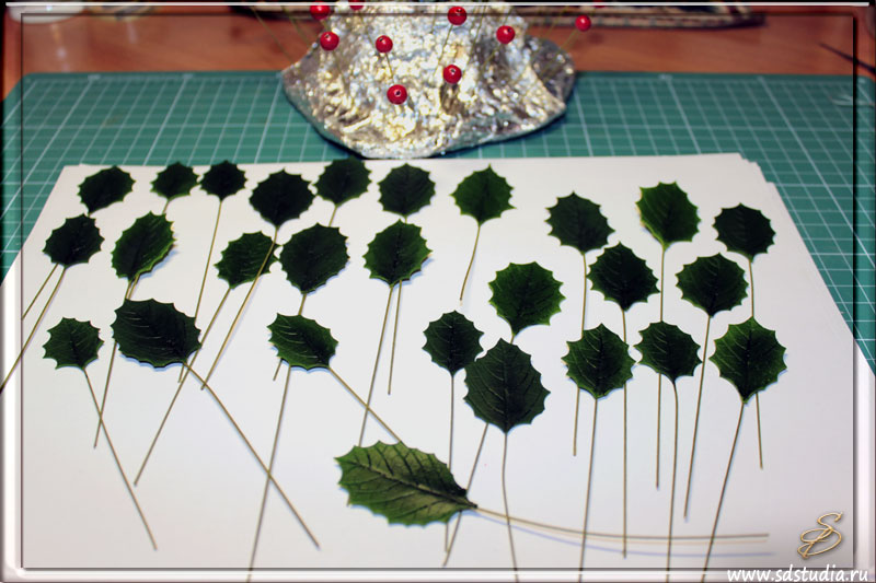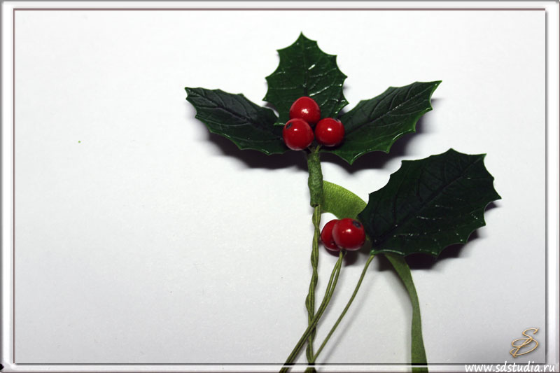 Начинаю сборку с "макушки", на которой должно быть три листочка и три ягодки. Скручиваю ножки листочков и ягодок, чтобы они не распадались.