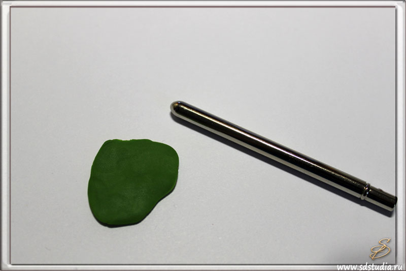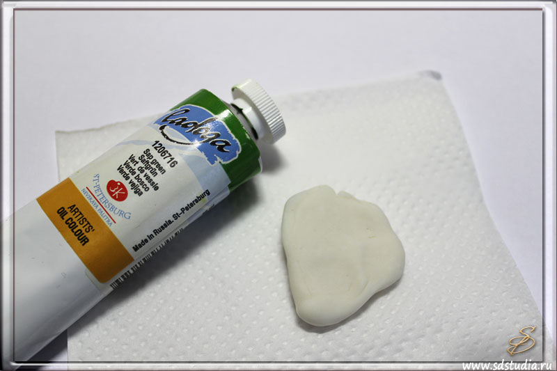 Переходим к созданию листочков. Можно взять сразу зеленую пластику Modena, но у меня под рукой ее не оказалось. Поэтому я взяла белую пластику Modena и масляную краску "Травяной зеленый", добавила немного краски в пластику и тщательно перемешала.