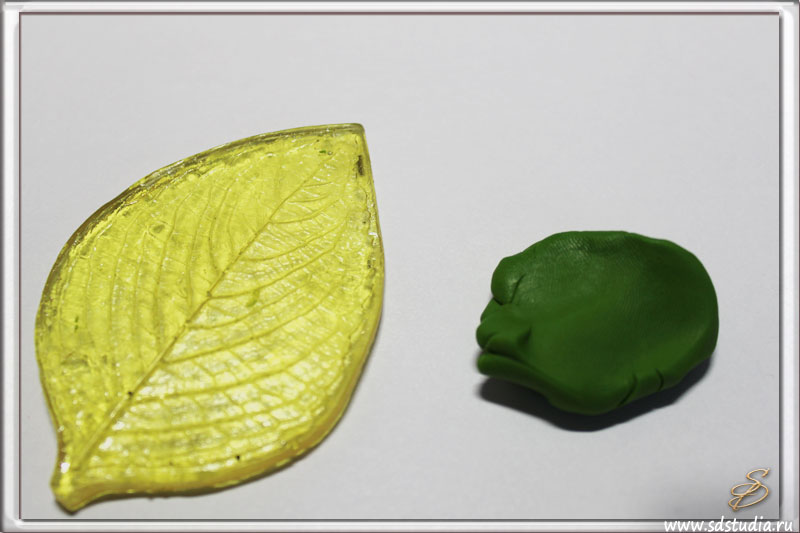 Получился кусочек пластики однородного зеленого оттенка. Теперь беру молд "Лист розы" и совсем чуть-чуть смазываю его жирным кремом, чтобы пластик не прилип.