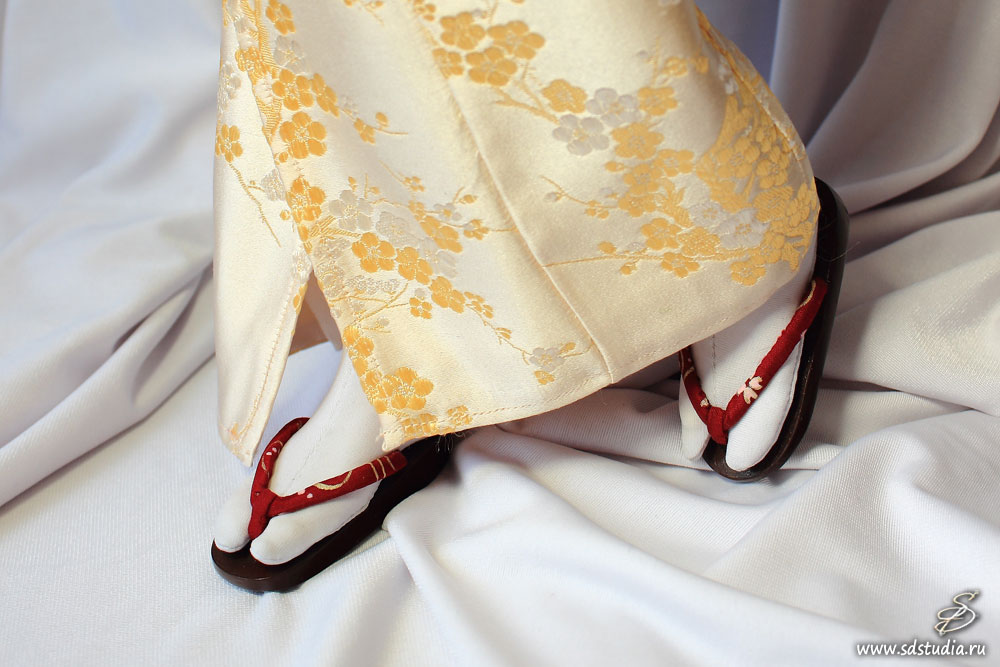 Общеизвестный факт - красивые и нарядные японские кимоно носятся с красивой национальной японской же обувью (гэта, дзори). А эта самая национальная обувь (в парадно-выходном варианте) носится со специальными носочками - таби. Вряд ли вы увидите где-нибудь прекрасную гейшу или майко в шикарном кимоно и босиком. Только в белоснежных таби! Да и самураи предпочитают к парадной одежде черные таби. Вот эти самые носки таби и будут нашим спасением. С помощью таких носочков можно "нарастить" ногу куклы и сделать "разделенные пальцы" для ношения гэта. Показываю, как это можно реализовать.