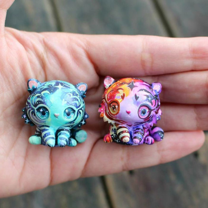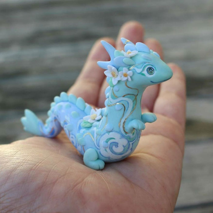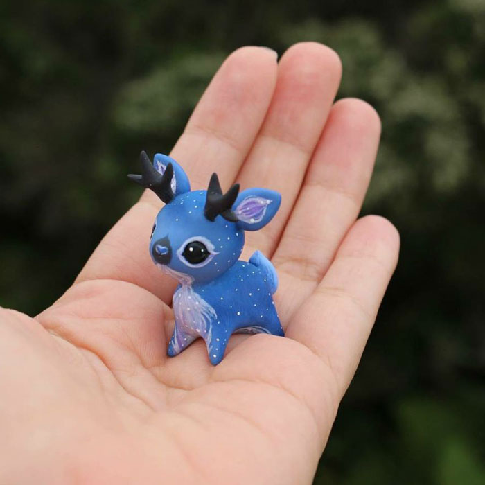 Ну и на закуску - миниатюрные фигурки животных. Как настоящих, так и несуществующих. Полимерная пластика - уникальный материал. Ему можно придать любую необходимую текстуру. И даже если для этого нет под рукой специальных текстурных молдов, всегда можно найти что-то подходящее под рукой. Например, текстуру кожи научились имитировать с помощью мятой фольги. Не верите? Погуглите! А если вам не хватает “базовых” цветов пластика для лепки, можно использовать краски, как это делает Амба Джейкобс (Amba Jacobs), мастер-миниатюрист из Новой Зеландии, создающая удивительных волшебных животных и человечков.