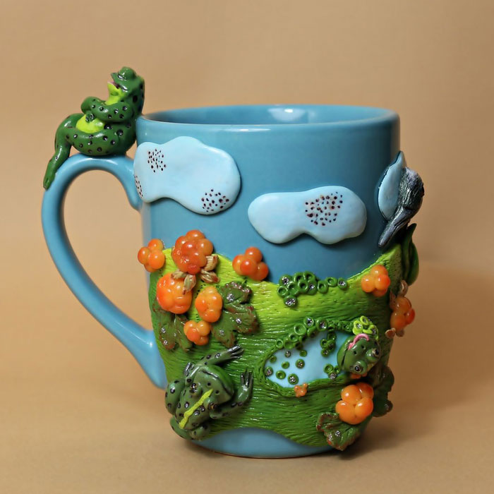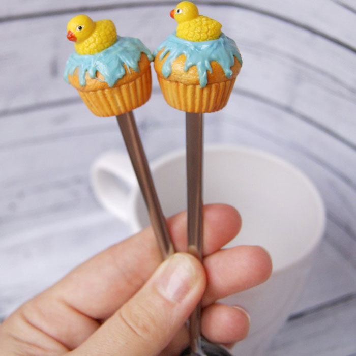 Такие “украшательства” стали возможны благодаря тому, что ложки-чашки прекрасно выдерживают температуру запекания полимерной глины. Декор создают сразу на “объекте”, а потом все вместе ставят в духовой шкаф или специальную печку для запекания.