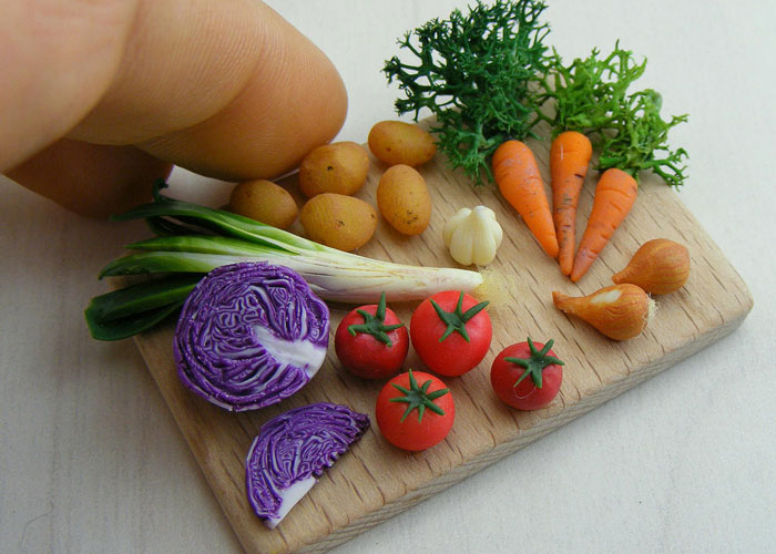Среди мастеров пластиковой микро-еды широко известен талантливый израильский мастер Аарон Шей (Aaron Shay). Он делает потрясающие кулинарные миниатюры для кукольных домиков и для бижутерии. Его фрукты, овощи и морепродукты так и просятся “на зубок”!