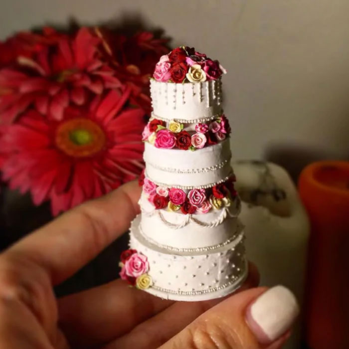 А вот талантливая художница Рейчел Дайк (Rachel Dyke) предпочитает сладенькое. Она создает потрясающие миниатюры свадебных тортов на заказ. Каждый её кулинарный шедевр умещается на ладони. А ещё они очень аппетитно пахнут, ведь Рейчел при лепке использует ароматические масла! Кстати, она является профессиональным гримером и декоратором тортов.