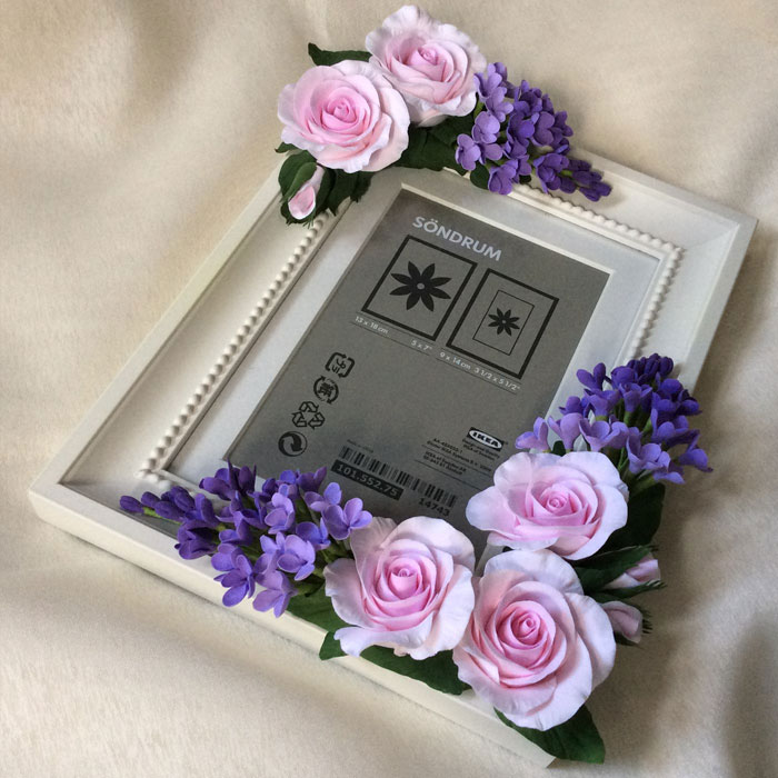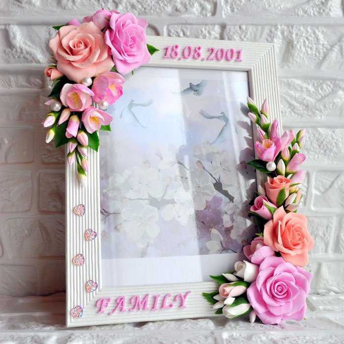 Кстати, именно для декора фоторамок часто используют самозастывающую полимерную глину, так называемый "холодный фарфор", который используют в керамической флористике. Такой декор очень красив, цветы выглядят как настоящие. Однако- его нельзя мыть. Только сухая чистка!