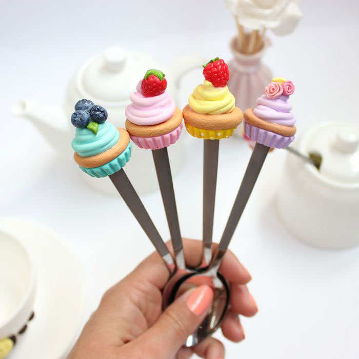 Маленькая пластиковая еда годится не только для кукольных домиков и украшений. Из нее получается отличный декор для ложек и чашек. Наверняка многие слышали такой термин “вкусная ложка”. Это ложечки с лепными украшениями в виде кексиков, пончиков и других сладостей.