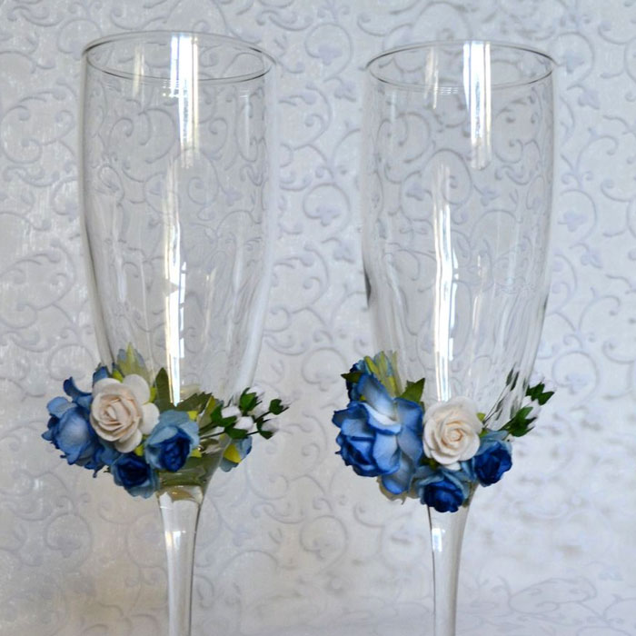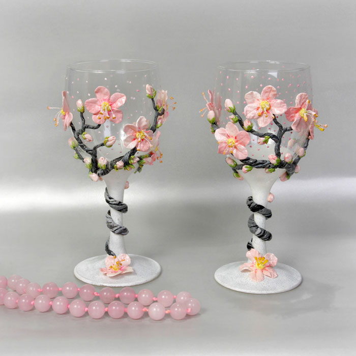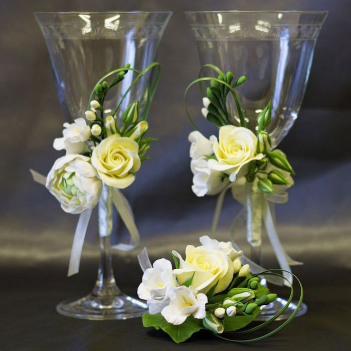 Кроме чашек-ложек некоторые мастера создают настоящие шедевры из бокалов, ваз, бутылок. Стекло ведь тоже термоустойчивое и прекрасно “переживает” запекание вместе с украшениями. Нежные и невесомые цветы на изящных стеклянных изделиях смотрятся очень красиво! Видели такие свадебные бокалы? Цветы на них слеплены из полимерной глины с таким мастерством, что кажутся живыми!