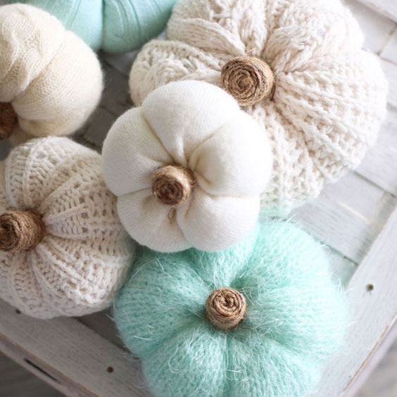 Как вариант, для создания вязаных тыкв можно использовать части вязаных вещей, например - свитеров. В этом случае принцип создания тыкв аналогичен работе с носками.