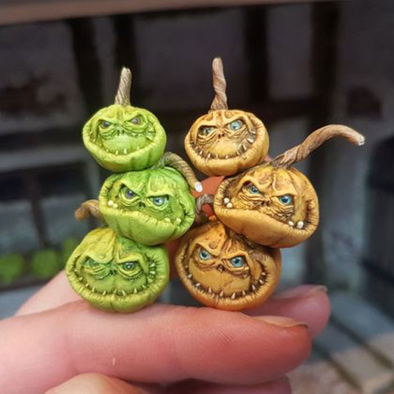 В зависимости от того, какой именно самоотвердевающий пластик вы используете, поверхность тыквы после полного высыхания можно отшкурить и окрасить в нужный цвет. Подробнее о том, какие самоотвердевающие пластики существуют и как с ними работать, читайте в обзоре. Так же можно использовать разные дополнительные декоративные элементы. Вот вам несколько примеров для вдохновения: