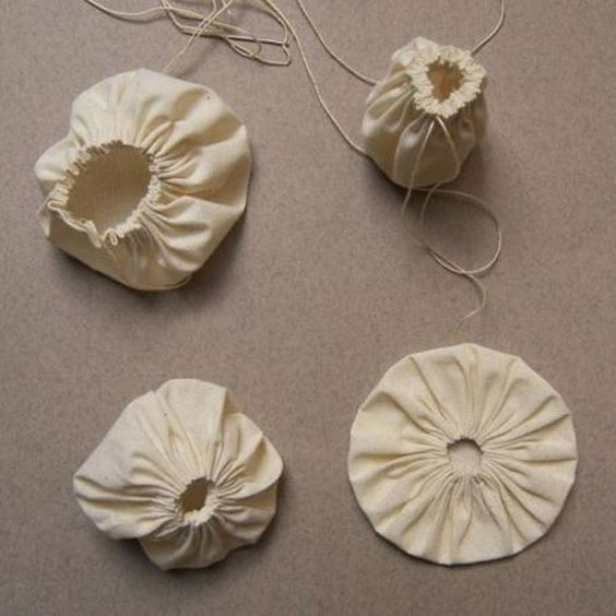 - Круг – отлично подойдет для тонких тканей: ситца, тонкого хлопка. Из ткани вырезается круг, по периметру собирается на нитку и стягивается. Получается такой своеобразный мешочек, который наполняется холофайбером, синтепухом или подобным материалом.