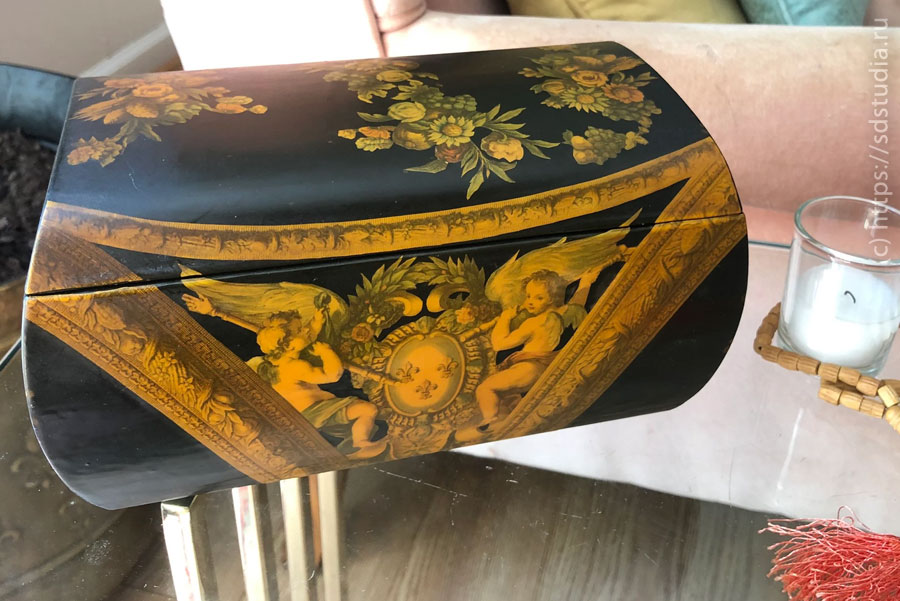 До России декупаж добрался к концу ХХ века. Известно, что на производстве купца Коробова мастера клеили гравюры под лак на табакерки.