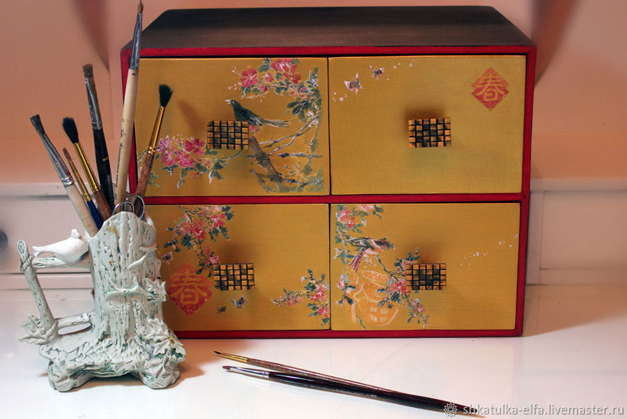 Декупаж как искусство декорирования зародился очень давно. Многие источники сообщают, что впервые такая техника декора появилась в Китае. Существуют упоминания об отделке изделий декоративной бумагой и лаковым покрытием, датированные XII веком.