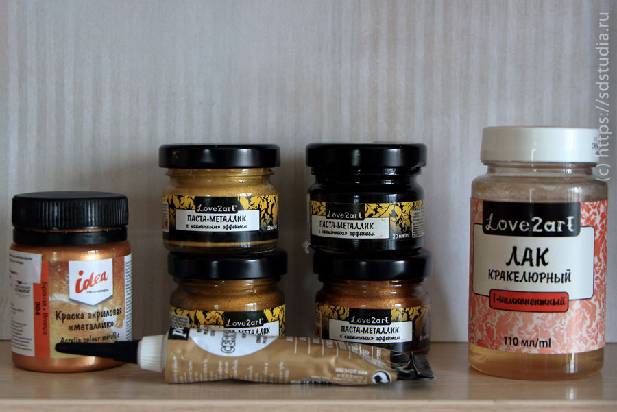 Это те основные материалы, которые потребуются обязательно. А вот что ещё вам понадобится – будет зависеть от того, в каком стиле вы собираетесь делать работу и какие художественные эффекты захотите использовать. Итоговый список может оказаться весьма впечатляющим и содержать: поталь, декоративные элементы (картонные, гипсовые или металлические), воски, патины, специальные пасты, кракелюрные лаки, лаки со всевозможными эффектами, текстурные пасты и гели, контуры и т.д.и т.п.