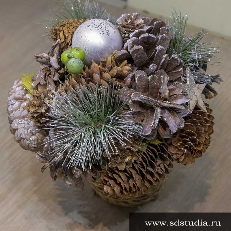 - Новогоднее деревце из шишек - топиарий, с новогодними игрушками и мишурой.