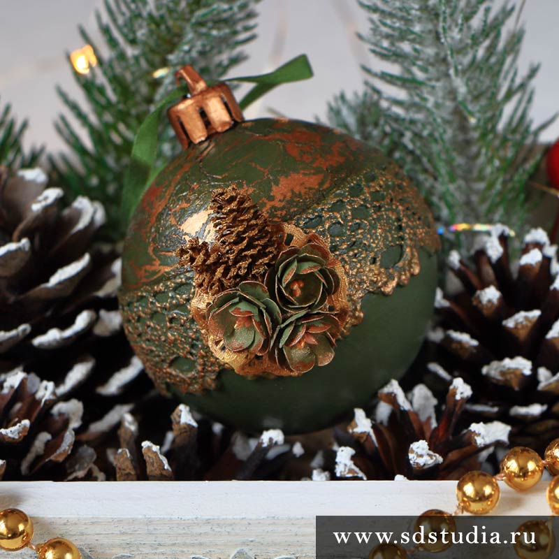 - Шар из шишек с ёлочными игрушками - подвесной декор для украшения интерьера.