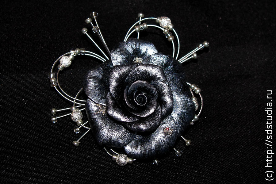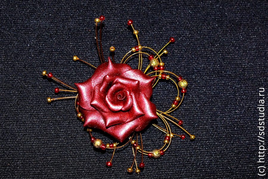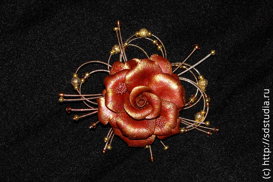 Броши из пластики в виде роз сделаны из смеси запекаемых пластиков Cernit + Sculpey. Для их украшения использованы декоративные элементы из ювелирного тросика, бусин и бисера. Броши тонированы перламутровыми пигментами PearlEx, края лепестков расписывались акриловыми металликами.