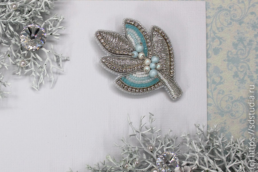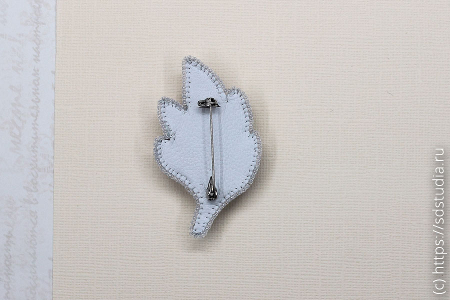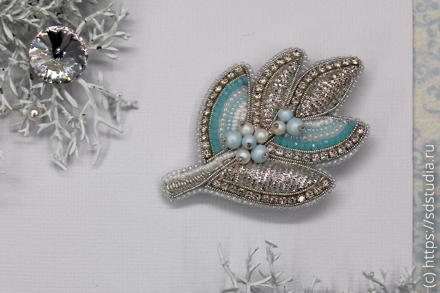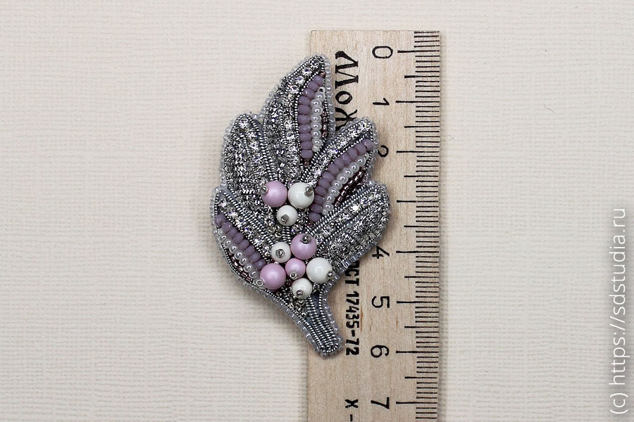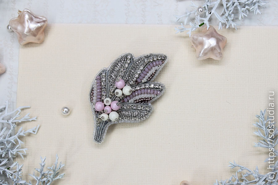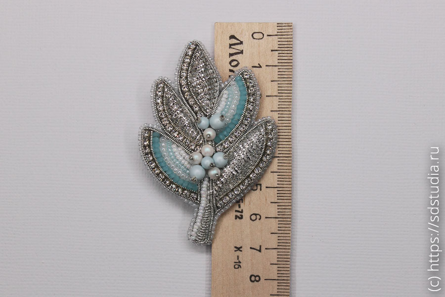 Брошь "Веточка", вышивка серебряной канителью и бусинами в технике золотного шитья
