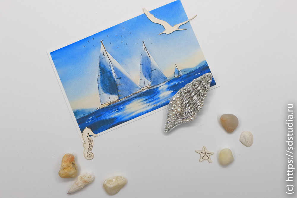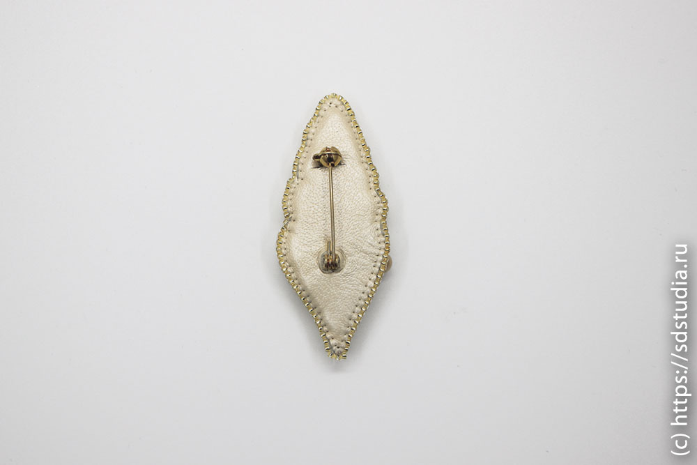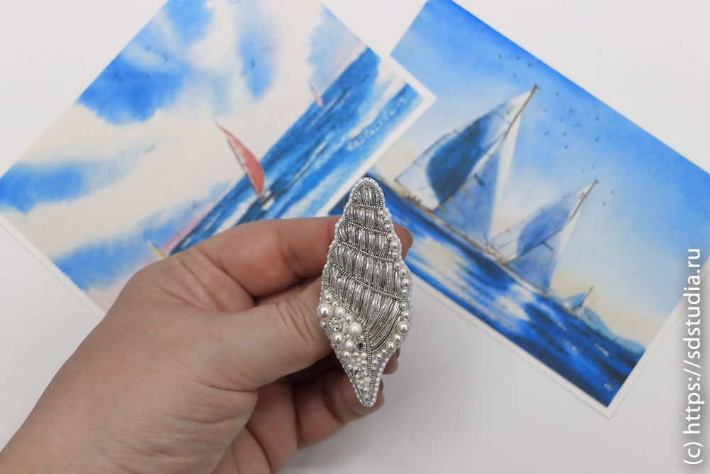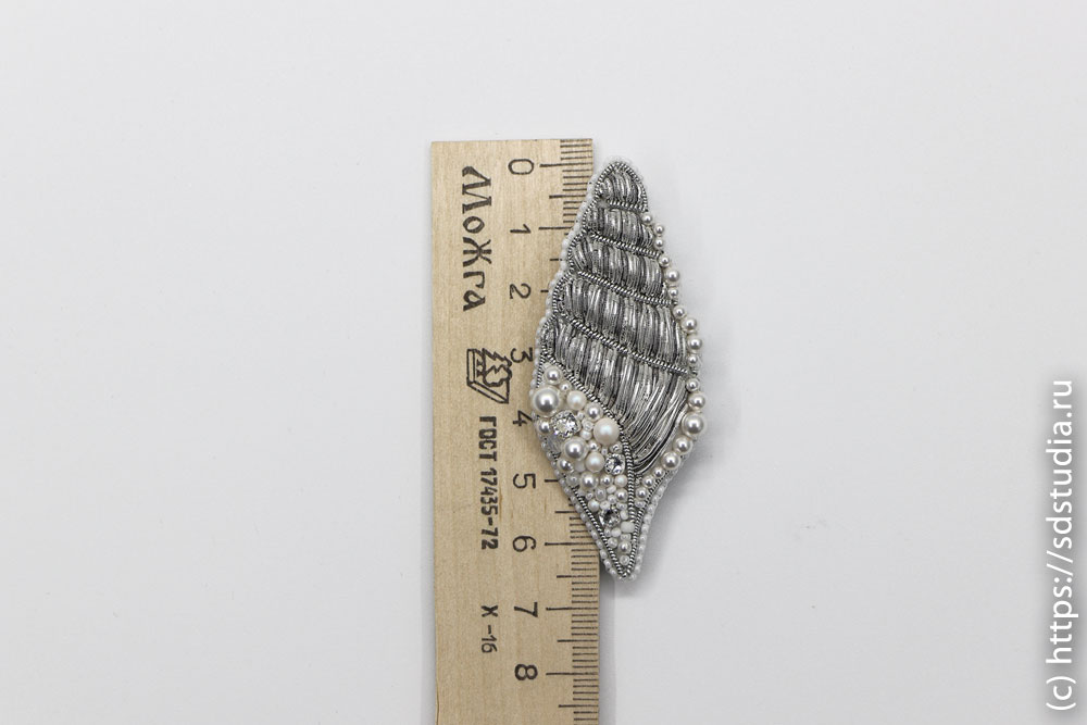 Брошь "Ракушка" выполнена из нескольких видов канители с добавлением хрустального жемчуга Сваровски, бусин и страз. Вышивка выполнена по объемному настилу и передает рельеф настоящей ракушки. Изнанка броши сделана из натуральной кожи, держатель - японская булавка с фиксатором. Край обработан японским бисером TOHO.