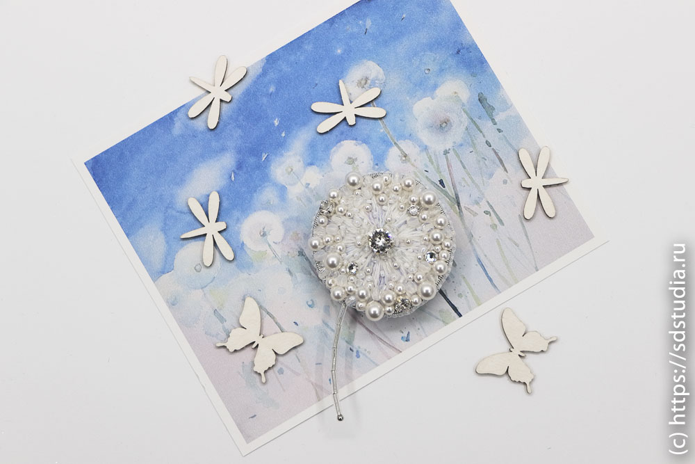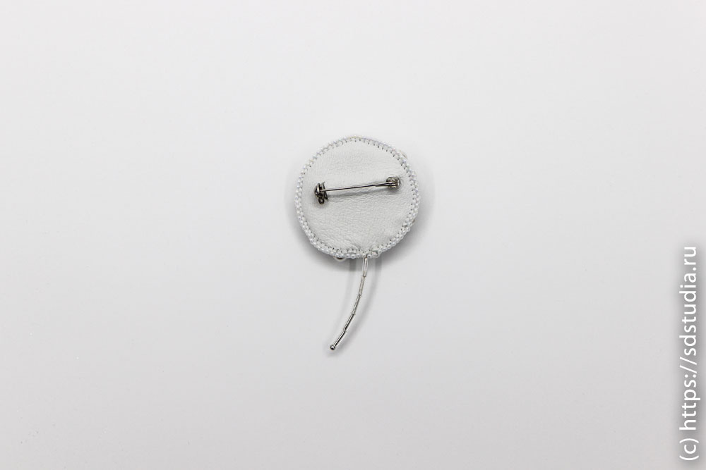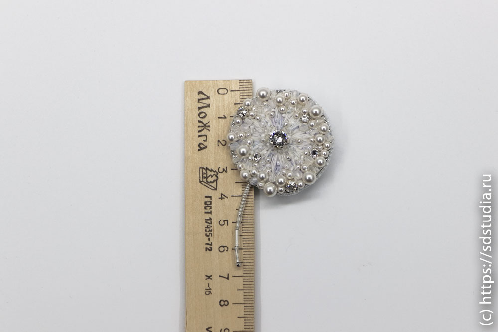 Основу броши "Одуванчик" составляет вышивка из шерстяного и меланжевого мулине "DMC" высшего качества. Поверхность расшита стразами Сваровски и хрустальным жемчугом Сваровски с добавлением японского бисера TOHO. Изнанка броши сделана из натуральной кожи, держатель - японская булавка с фиксатором. Край изделия обшит мельчайшим японским бисером TOHO.