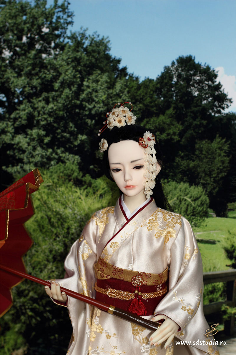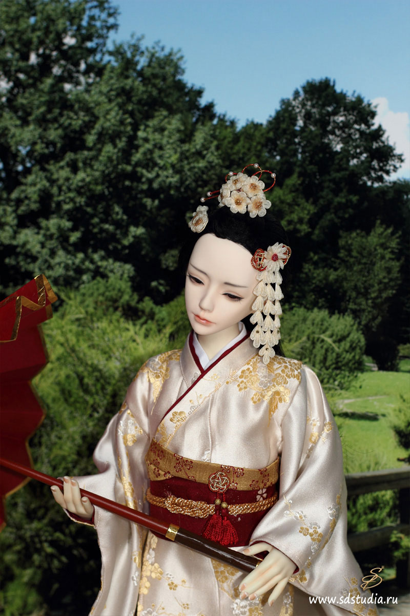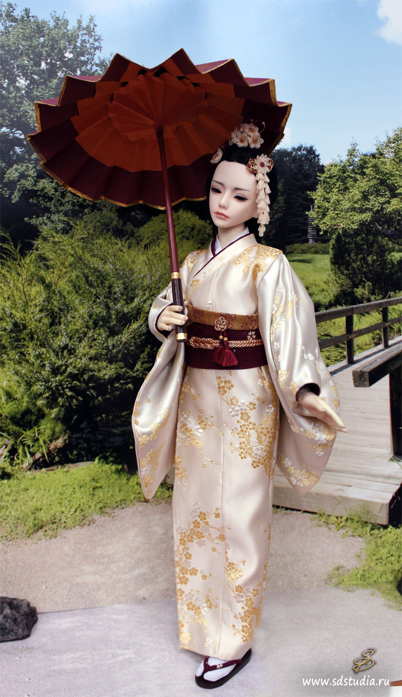 Подбор цветовой гаммы я основывала на контрасте нежных и бледных оттенков с агрессивным бордовым. Классическое японское кимоно для куклы технически шить довольно просто, оно все состоит из прямоугольников. Поэтому основой яркого впечатления является подбор рисунков и оттенков. Мне пришлось пересмотреть множество источников и фотографий, прежде чем создать этот костюм. Чем интересна работа с костюмами? Если не можешь найти подходящий материал - приходится что-то придумывать и постоянно учиться чему-то новому. В этот раз я научилась делать цветочки-канзаши диаметром 1см и расписывать ткань красками.
