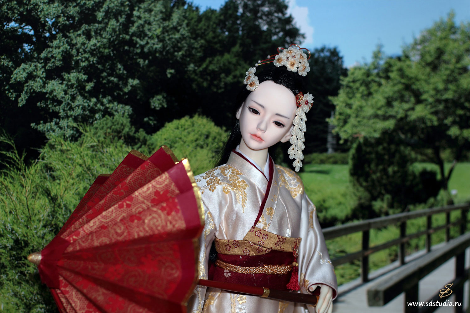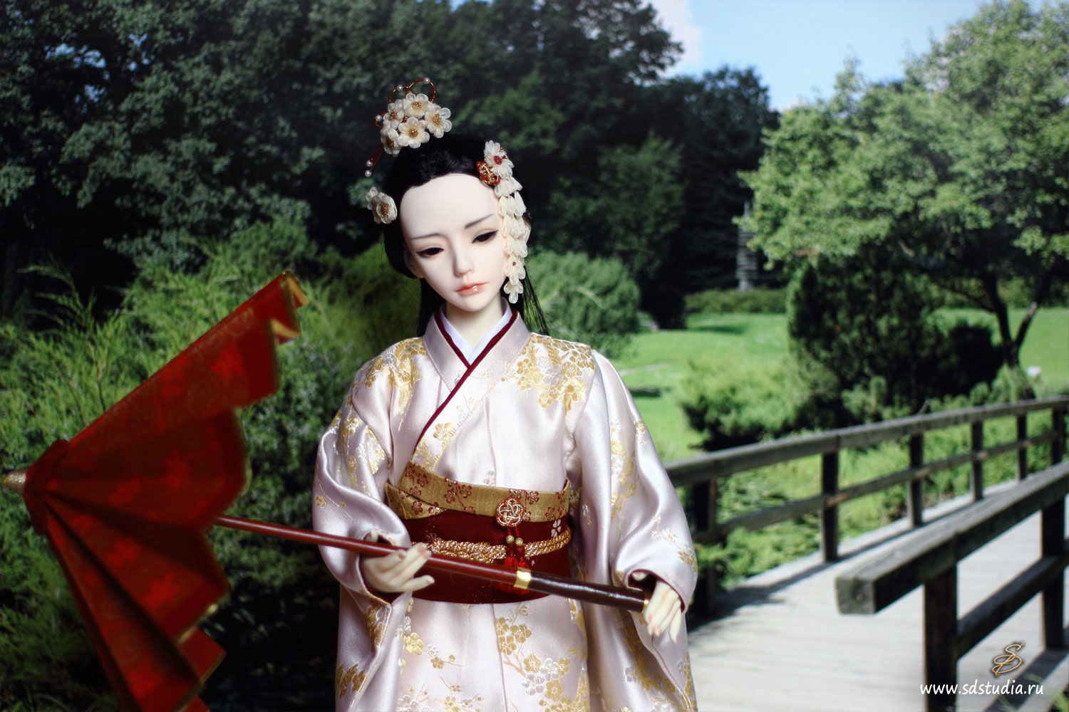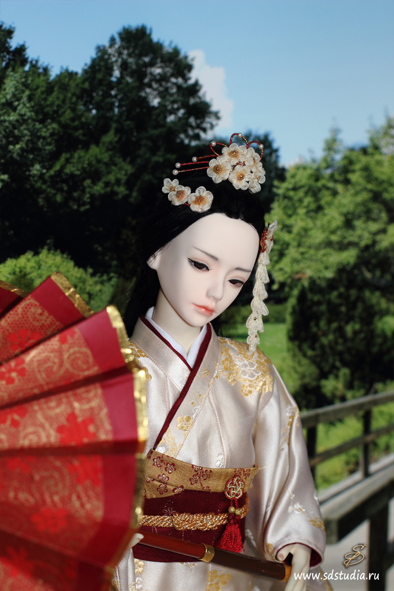 Подбор цветовой гаммы я основывала на контрасте нежных и бледных оттенков с агрессивным бордовым. Классическое японское кимоно для куклы технически шить довольно просто, оно все состоит из прямоугольников. Поэтому основой яркого впечатления является подбор рисунков и оттенков. Мне пришлось пересмотреть множество источников и фотографий, прежде чем создать этот костюм. Чем интересна работа с костюмами? Если не можешь найти подходящий материал - приходится что-то придумывать и постоянно учиться чему-то новому. В этот раз я научилась делать цветочки-канзаши диаметром 1см и расписывать ткань красками.