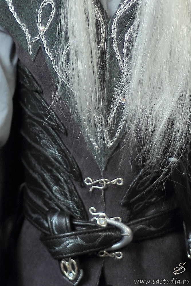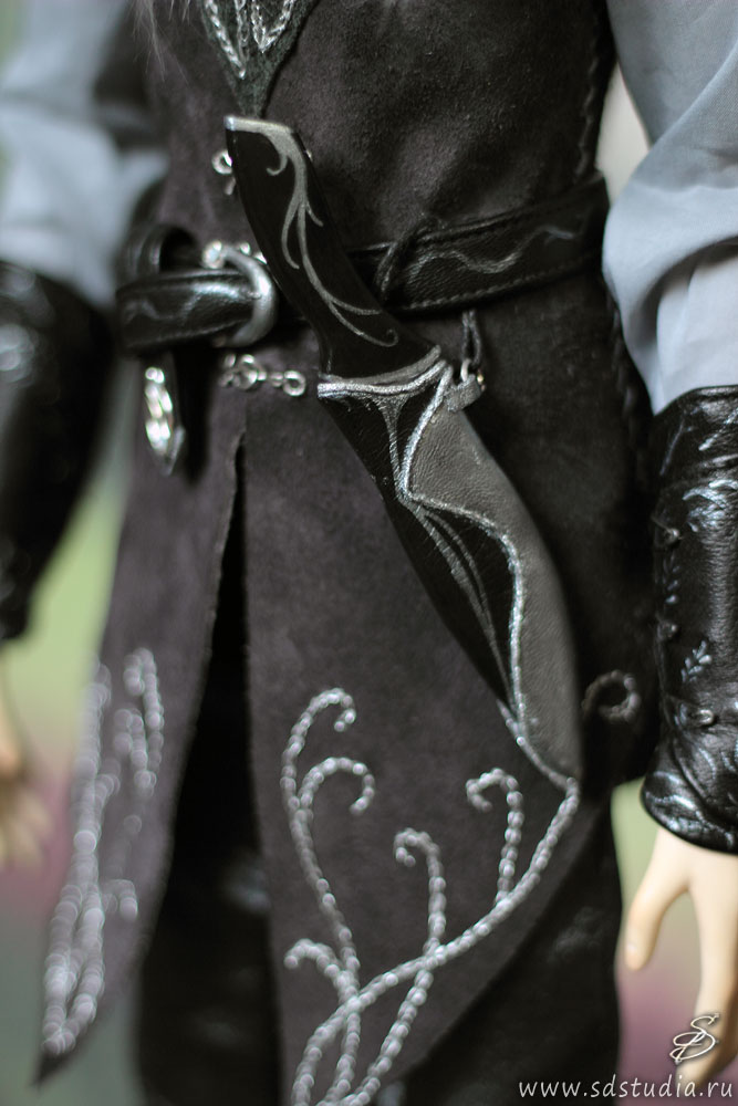 Также вышивкой серебряным люрексом украшены полы безрукавки. На поясе за спиной висят ножны для двуручного меча. Ножны делались по той же технологии, что и ножны для кинжала. Процесс создания ножен для кинжала был описан мною довольно подробно в мастер-классе. Кожаные наручи двухслойные, расписаны акрилом, снабжены крючками и петлями для застегивания. Делались по образу и подобию наручей Леголаса из «Властелина колец». Крючки я делала сама, так как купить крючки такого размера не представляется возможным, такие маленькие просто не выпускают.