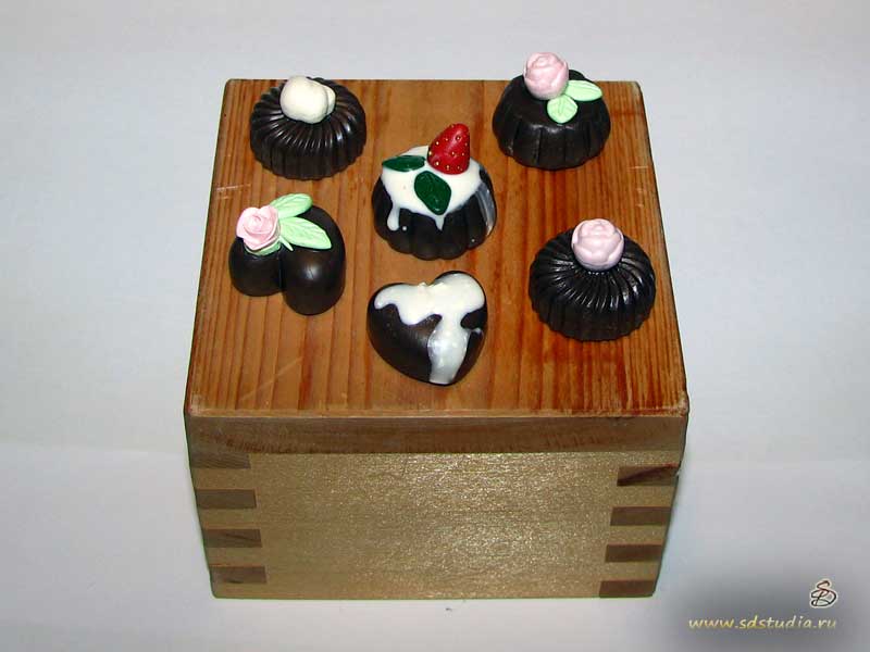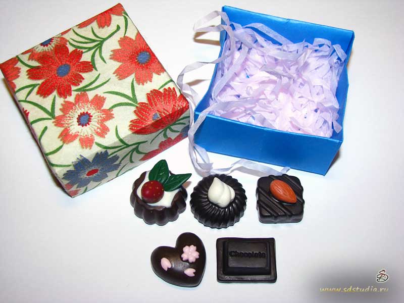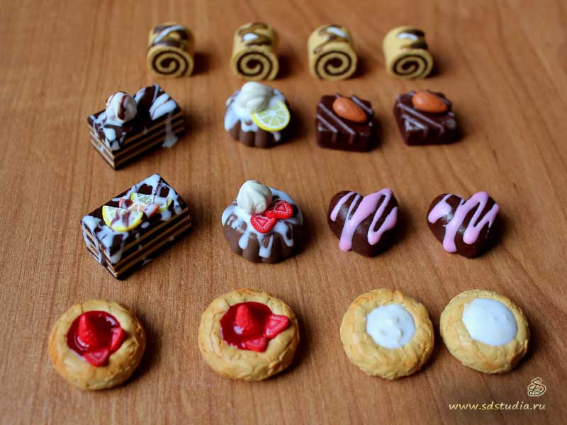 Миниатюрные шоколадные конфеты разнообразных форм и размеров изготавливаются из запекаемого пластика и покрываются матовым акриловым лаком, который сохраняет их яркий и праздничный вид. Разнообразие форм и расцветок зависит только от вашей фантазии. Наша кондитерская иднустрия шагнула так далеко, что шоколад сейчас бывает не только коричневый но и белый, и даже зеленый (я имею ввиду шоколад японский, с добавлением зеленого чая).