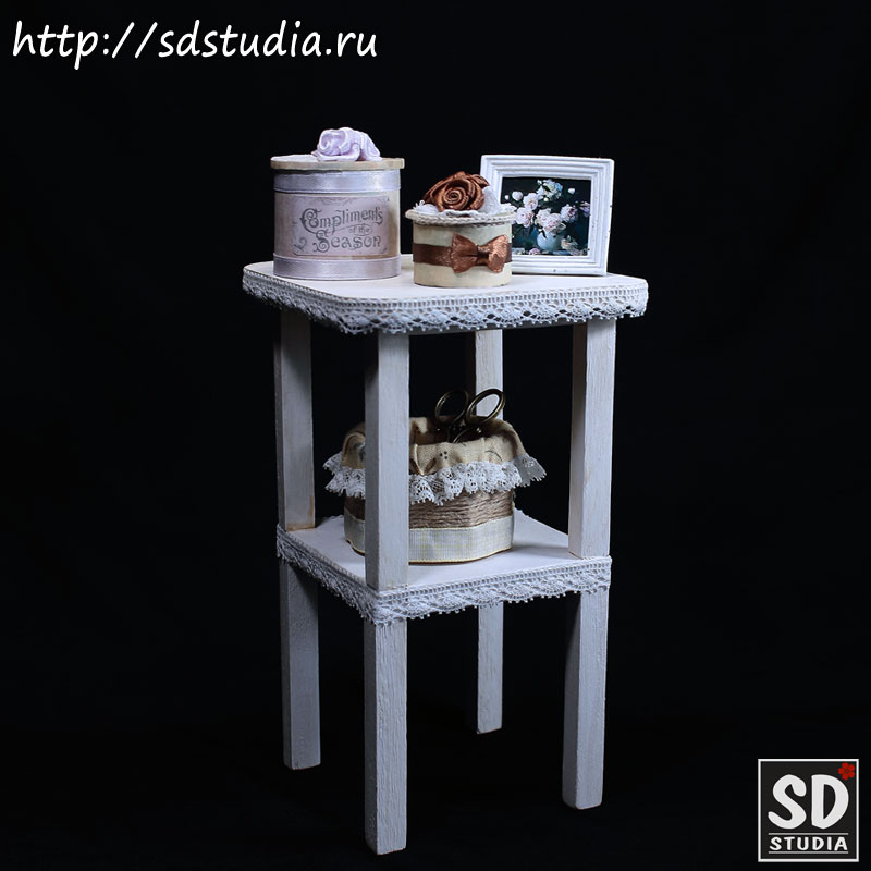 Этажерка получилась довольно вместительная. По крайней мере, на ней отлично разместились круглые коробочки с разными мелочами и миниатюрная корзинка для рукоделия.