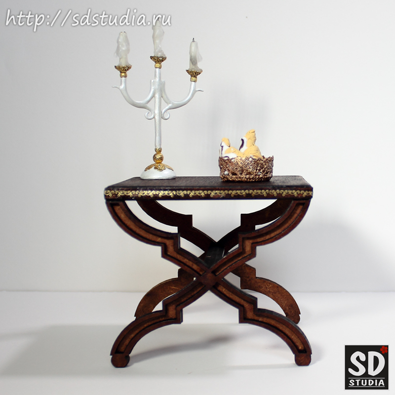 Этот миниатюрный кукольный стол сделан из заготовки фирмы "ЛАК-Дизайн", котора производит сборную мебель для кукол из МДФ разных форматов и продает ее в виде "конструктора". Конкретно эта заготовка изначально задумывалась ее создателями как основа под пуфик. Но я решила сделать из нее столик. Для этого я выпилила дубликат верхней детали из фанеры толщиной 4мм и таким образом сделала более толстую столешницу.