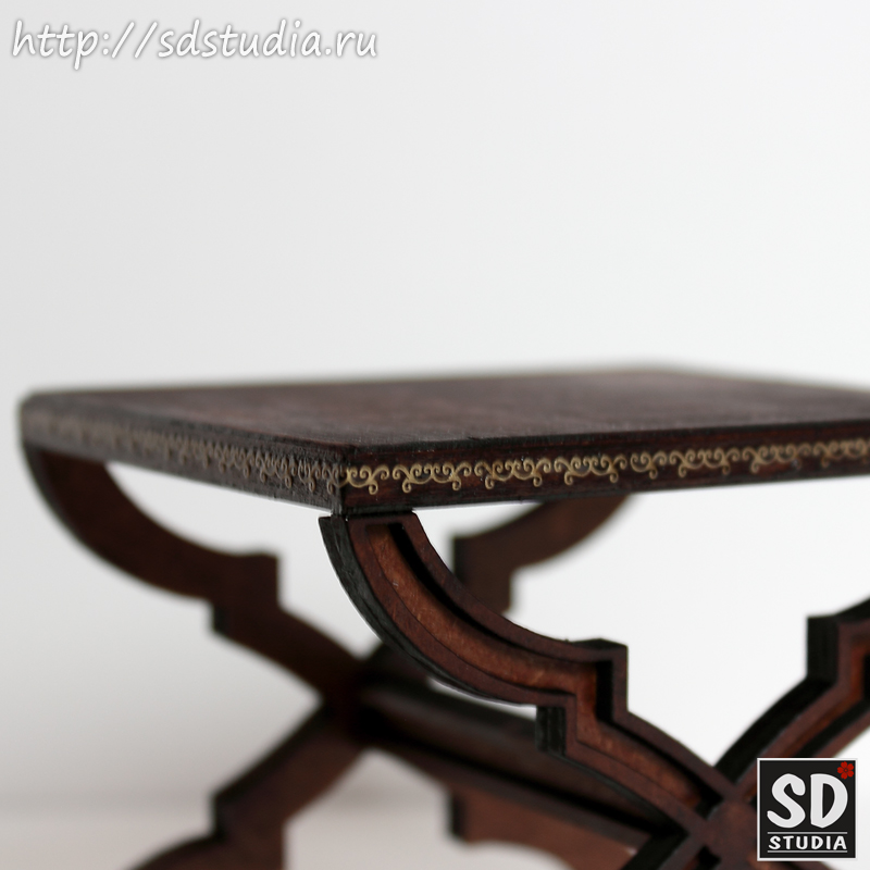 Детали этого мебельного "конструктора" прекрасно склеиваются на клей ПВА. Но мне больше нравится использовать столярный клей "Момент", он быстрее схватывается и держит, на мой взгляд, прочнее. Тут главное - на время склеивания обеспечить плотное прилегание деталей. Детали кукольного столика полностью склеиваются уже через час-полтора и работу по декору можно продолжить. Дополнительную столешницу я так же приклеивала этим столярным клеем. Ее утолщившийся край я декорировала тонким шпоном (так же приклеивала на столярный клей) и украсила изящным узором в "эльфийском" стиле.