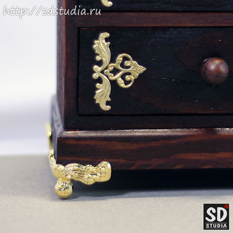 Комод для куклы на этой фотографии был сделан из деревянной заготовки, купленной в магазине товаров для творчества. Подобные заготовки продаются в отделах "Заготовки для декупажа". Я подобрала модель, которая подойдет по размеру кукле и доработала ее. Стандартная деревянная заготовка с выдвигающимися ящиками. Из нее можно сделать шкатулку для украшений, я же решила пополнить свою коллекцию мебели для кукол. Размер комода - 11см * 13,5см. Эти комодики декорируют по-разному. Часто их красят и декорируют с помощью декупажа. Мне надо было сделать комод, который мог бы гармонично смотреться с кукольной кушеткой и миниатюрным столиком, которые у меня уже были сделаны. Поэтому я опять выбрала морилку и филигрань для декора.