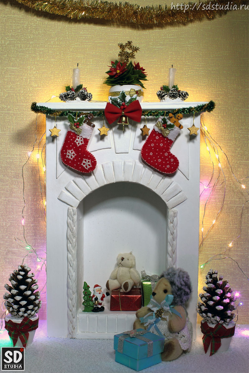 После того, как собранный камин высох и нему была приклеена лепнина и кирпичики, он был покрашен белой акриловой краской и акриловым грунтом в несколько слоев.