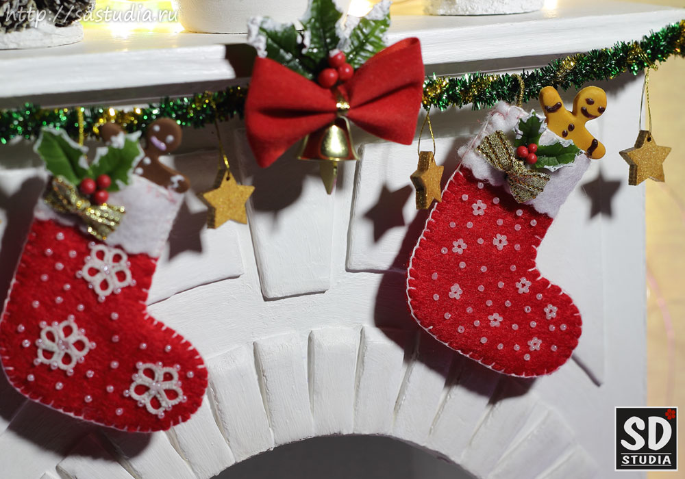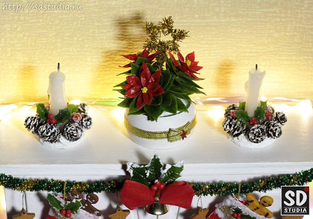 Украшения для камина можно выполнять на любой вкус. Мне захотелось украсить его красивыми миниатюрными рождественскими подсвечниками из шишек, яркой крошечной пуансеттией в горшке и "рождественскими сапожками" из фетра. На следующий год украшения могут быть совсем другие. В общем, декор можно обновлять каждый год.