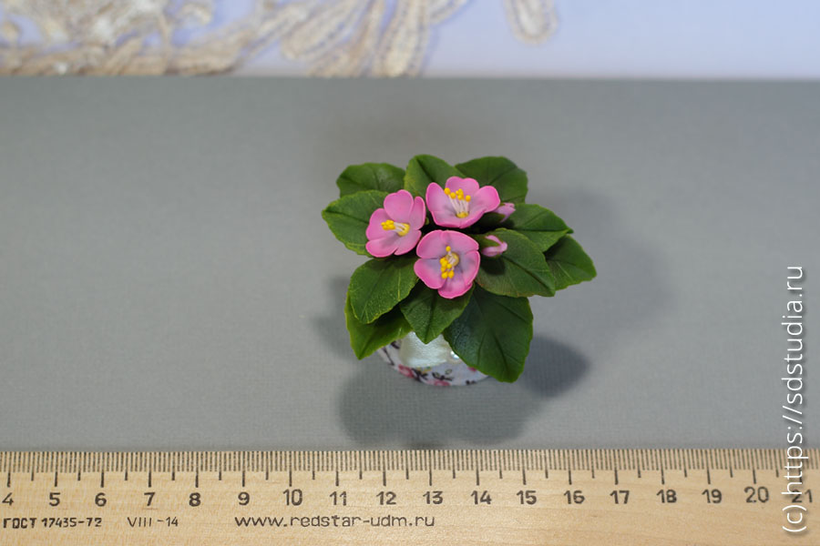 Все цветы выполнены из флористической глины Fleur. Благодаря нежной фактуре материала лепестки получились тонкие, почти просвечивающие. Горшок одного цветка сделан по полюбившейся мне технологии из обрезанных и обработанных деревянных шпажек для приготовления мини-шашлычков в домашних условиях. Об этой технологии я уже рассказывала в своем мастер-классе по изготовлению миниатюрного топиария. Эти шпажки - очень полезный для миниатюрзика материал.