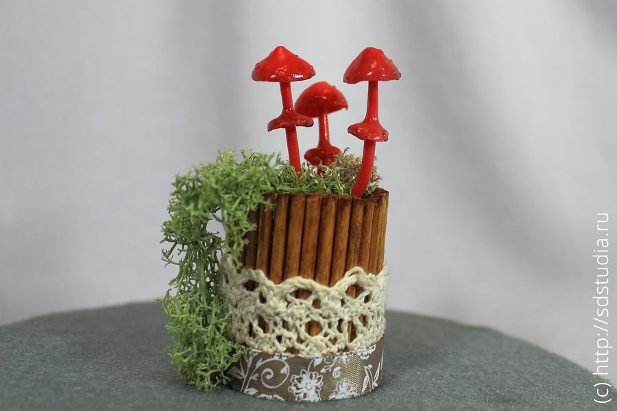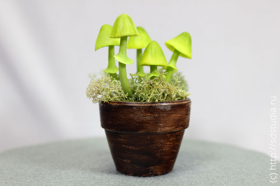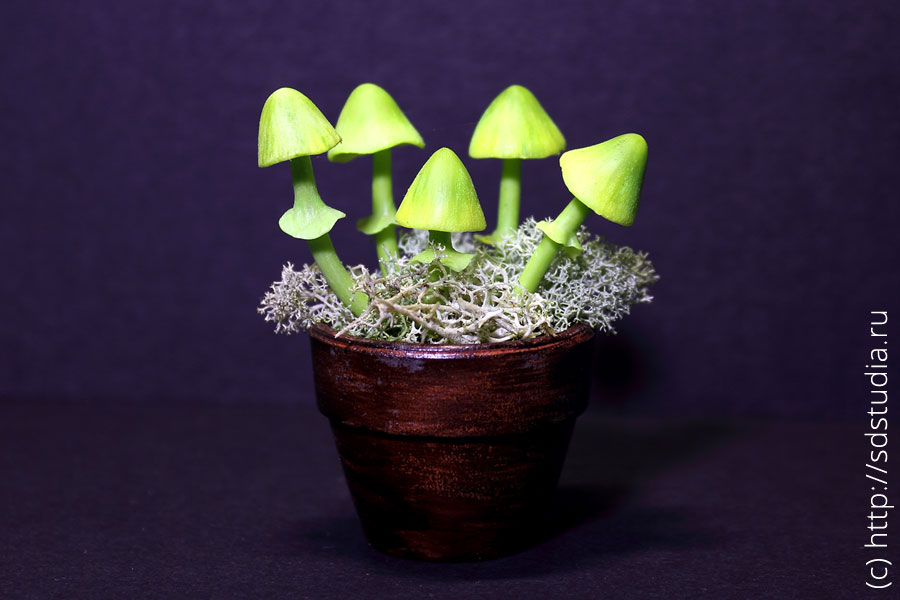 Очень оригинально смотрятся разноцветные поганки в горшках. А можно сделать так, что они будут ещё и по ночам светиться!